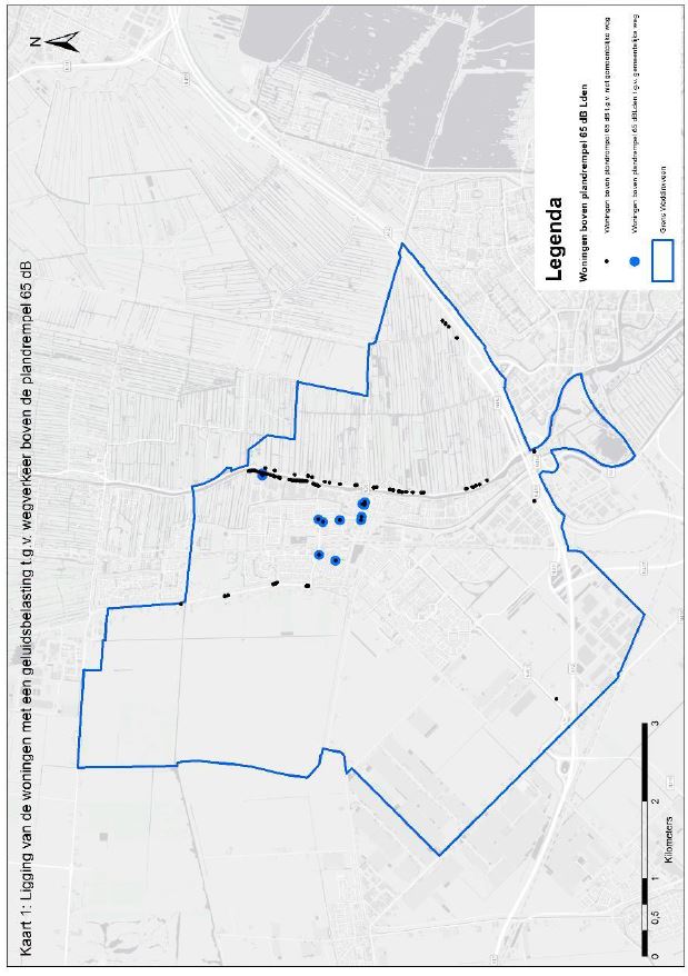 Het gros van de woningen binnen Waddinxveen waarop de geluidsbelasting wordt bepaald door lokale wegen, zijn zogenaamde B-lijst woningen met een geluidsbelasting tussen de 58 en 62 dB Lden. De geluidsbelasting ter plaatse van deze woningen is dus lager dan de plandrempel van 65 dB.