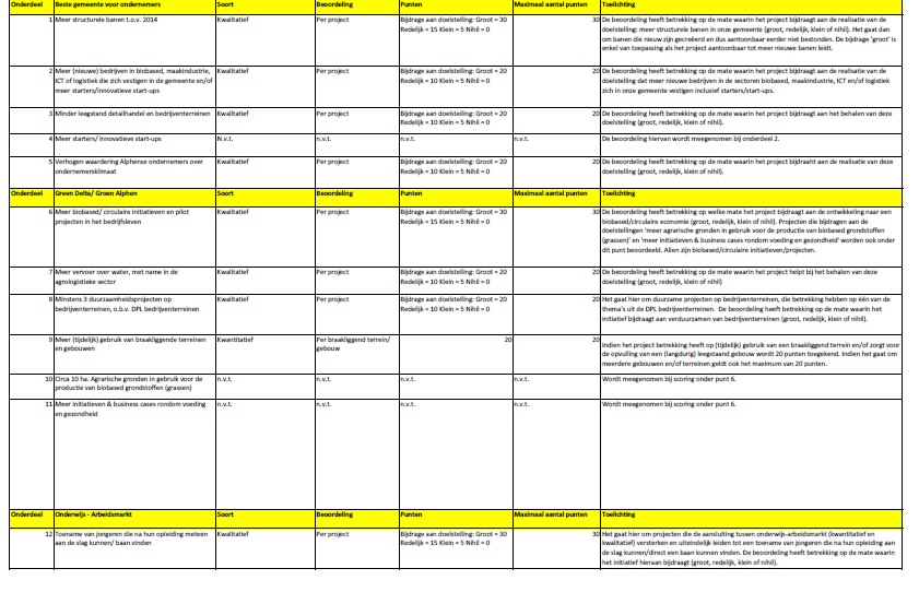 De beoordeling van de aanvragen gebeurt op basis van het toetsingskader. Om voor cofinanciering in aanmerking te komen moeten projecten in ieder geval ten minste 6 punten scoren op de inhoudelijke voorwaarden van het toetsingskader. De EDBA kan het College adviseren welke aanvragen het meeste bijdragen aan de doelstellingen van het Economisch Actieprogramma. Het College maakt vervolgens de finale selectie van de projecten waaraan cofinanciering beschikt wordt, mede op basis van het door de EDBA afgegeven advies. De rangorde van de projecten is bepalend voor welke projecten cofinanciering toegekend krijgen en welke niet. Gezien de aard van de tenderprocedure is in lid 11 een afwijking van de Asv opgenomen.