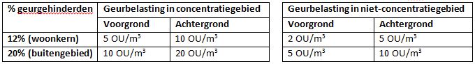 Bij de wettelijke beoordeling van de geurbelasting wordt gebruik gemaakt van de geurnormen welke zijn opgenomen in artikel 3 van de Wet Geurhinder Veehouderij (Wgv). Dit zijn de waarden 2 (woonkern) en 8 (buitengebied) ouE/m3 voor een niet-concentratiegebied en 3 (woonkern) en 14 (buitengebied) ouE/m3 voor een concentratiegebied. Bijlage 6-7 uit de Handreiking Wet Geurhinder Veehouderijen (Wgv), waaraan het PRA-onderzoek ten grondslag ligt, kunnen worden gebruikt door gemeenten bij het opstellen van het eigen beleid, en zijn behulpzaam bij het beoordelen of de geurhinder 'past bij de doelstellingen voor het gebied' en of de mate van geurhinder acceptabel wordt geacht. Hiermee wordt de relatie tussen geurhinder en de voorgrond- en achtergrondbelasting in ouE/m3 bepaald zoals in onderstaande tabel is weergegeven.