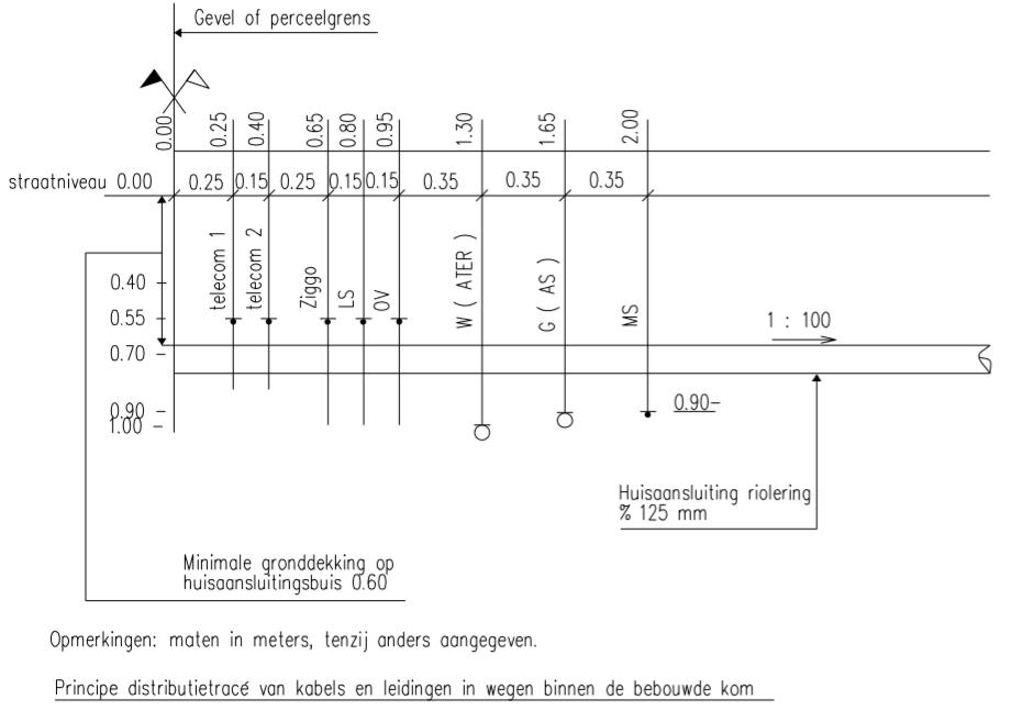 Binnen het kabel- en leidingtracé worden de kabels en/of leidingen qua horizontale maatvoering volgens een vaste volgorde ten opzichte van elkaar ingedeeld. Daarbij wordt er rekening mee gehouden dat de afstand tussen leidingen en kabels ten minste 0,35 m bedraagt. De horizontale indeling is weergegeven in het standaarddwarsprofiel, zie Hoofdstuk 10, bijlage 10.1.