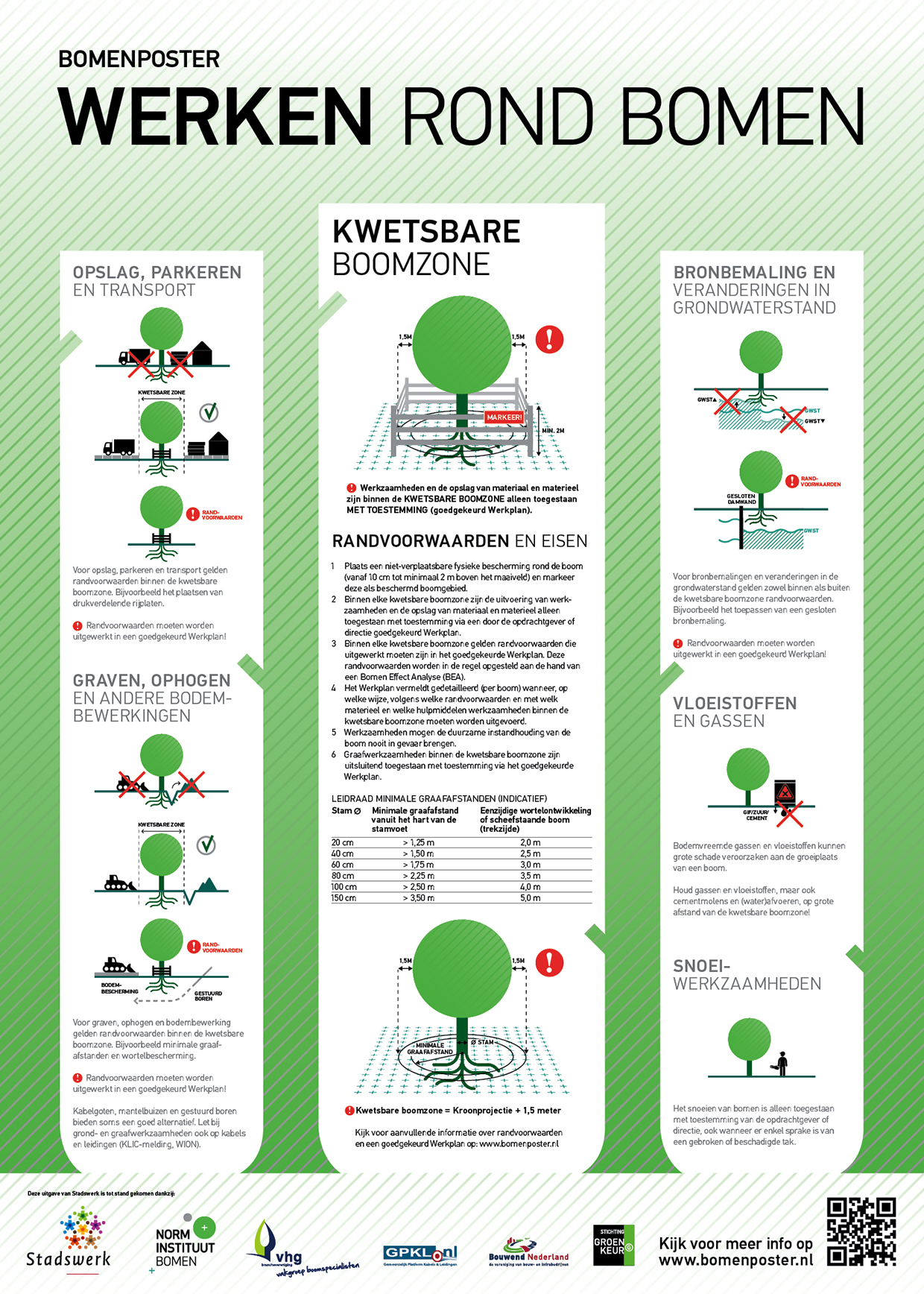 Het Norminstituut Bomen heeft als doel de kwaliteitszorg rond bomen te verbeteren. Het instituut ontwikkelt en standaardiseert kwaliteitseisen, richtlijnen en normen voor werkzaamheden in, rond en met bomen. De bomenposter "Werken rond bomen" toont de kwetsbare boomzone direct rond een boom en laat zien welke belangrijke randvoorwaarden er gelden binnen deze kwetsbare boomzone voor de uitvoering van werkzaamheden.