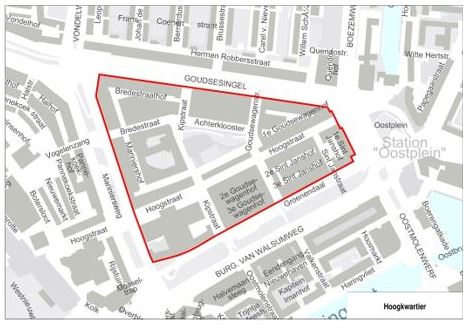 Het gebied Hoogkwartier omvat de straten Goudsesingel 12 t/m 284, Mariniersweg 2 t/m 274, Groenendaal 3 t/m 499, Oostplein 97 t/m 145 en 100 t/m 146, Hoogstraat 3 t/m 105 en 2 t/m 74, Achterklooster, Bredestraat, Bredestraathof, Sint-Janstraat, 1e Sint-Janshof, 2e Sint-Janshof, 3e Sint-Janshof, Goudsewagenstraat, 1e Goudsewagenhof, 2e Goudsewagenhof, 3e Goudswagenhof, Kipstraat.