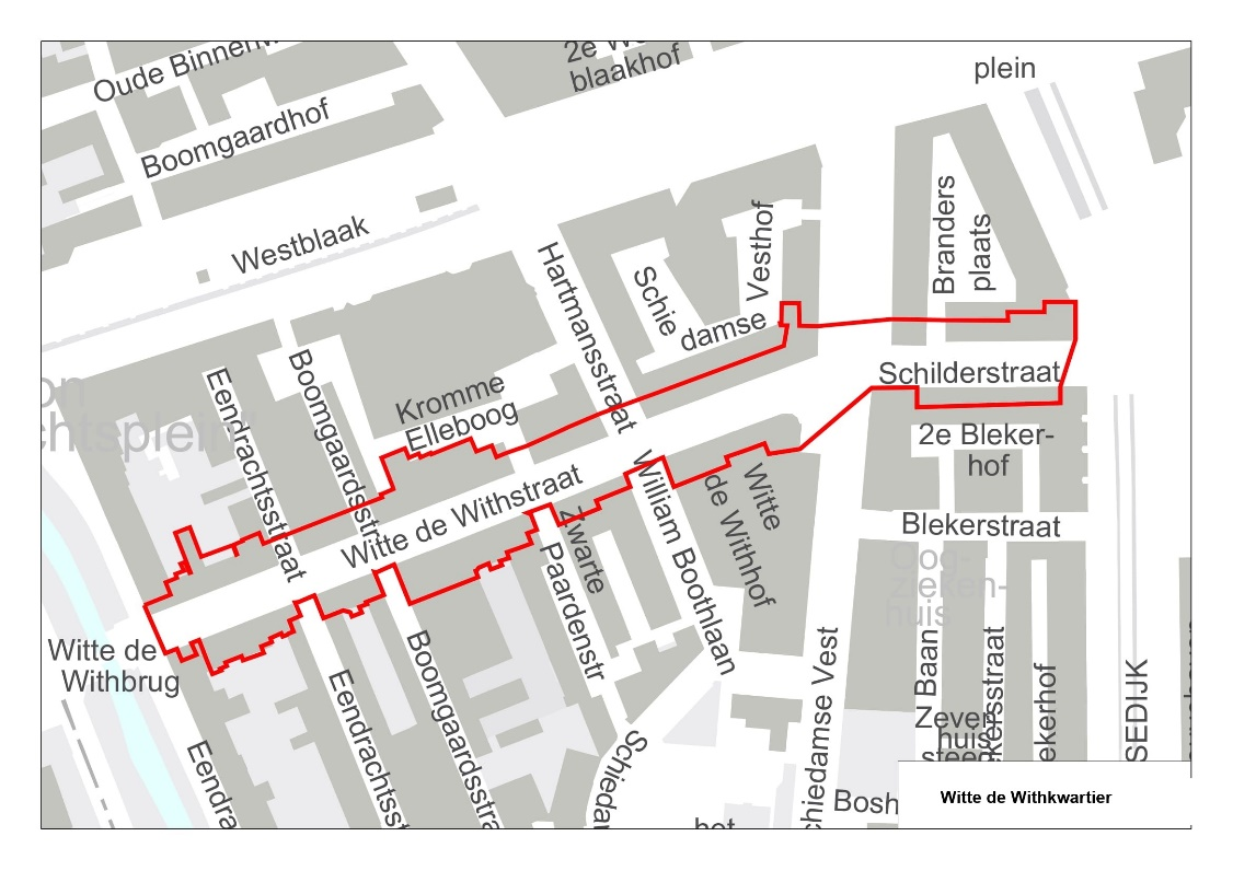 Het gebied Witte de Withkwartier omvat de straten Schilderstraat en Witte de Withstraat, inclusief de hoekpanden met de adressen, Schiedamse Vest 89, 89 MO001 89 BG, 148, Schiedamse Vesthof 16, Schiedamsedijk 51.