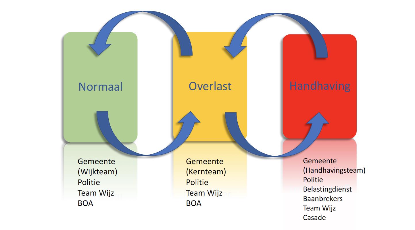 In het bejegeningsprotocol (zie bijlage 2) zijn de taken benoemd in de verschillende fasen van de aanpak: normaal, overlast en handhaving.