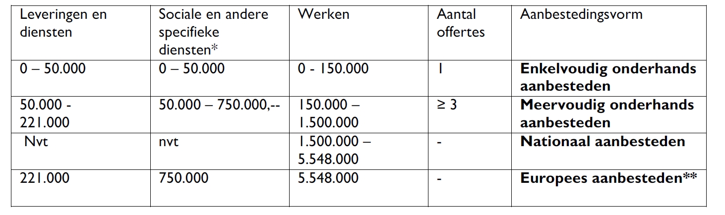 ** Drempelwaarden vastgesteld door de Europese Commissie voor de jaren 2018-2019. Deze waarden worden elke 2 jaar opnieuw door de Europese Commissie opnieuw vastgesteld. Nieuwe door de Europese Commissie vastgestelde Europese drempelwaarden treden automatisch in de plaats van de oude bedragen, zonder dat het beleid opnieuw moet worden vastgesteld.