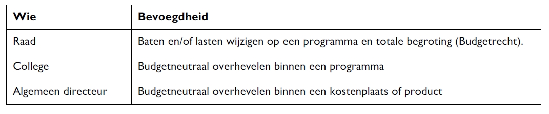 Het college is gemachtigd budgetten budgetneutraal over te hevelen binnen producten en programma's. De budgetverschuiving mag er niet toe leiden dat het totaal van de baten en/of lasten wordt verhoogd. Hiervoor heeft de Raad het budgetrecht.