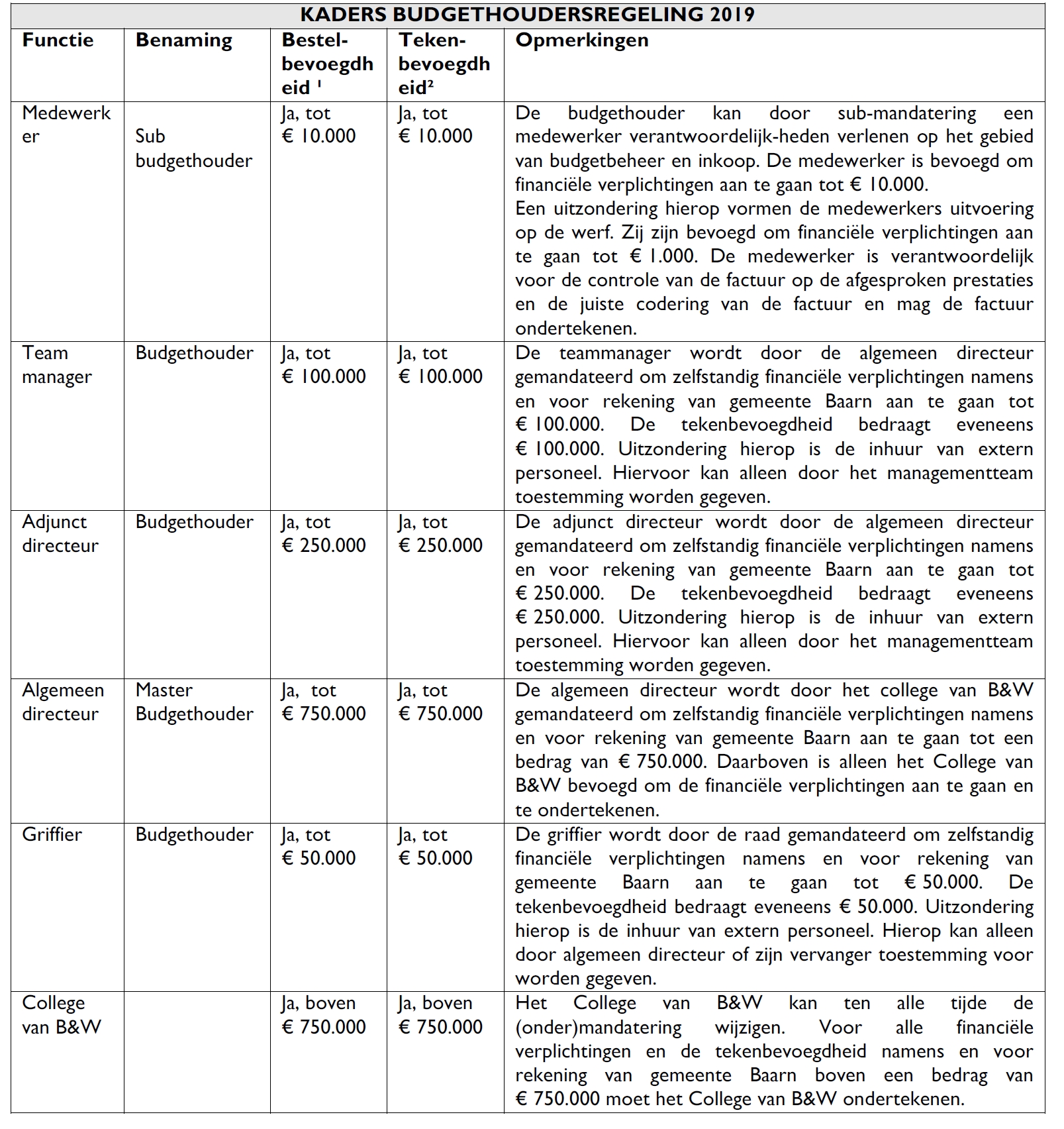 Op grond van de vigerende financiële verordening ex art 212 Gemeentewet (Gw) gemeente Baarn mandateert de raad het vaststellen van de Budgethoudersregeling aan het college.