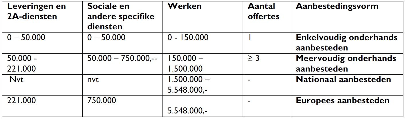 De hierboven genoemde drempelbedragen zijn minimale eisen. Het is zonder meer toegestaan een aanbestedingsvorm te kiezen die bij een hogere drempelwaarde behoort dan de geraamde waarde.