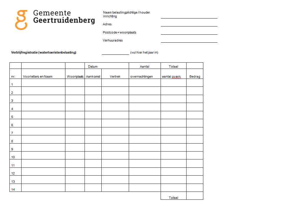 Bijlage WTA2 model voor het formulier van het verblijfregister watertoeristenbelasting