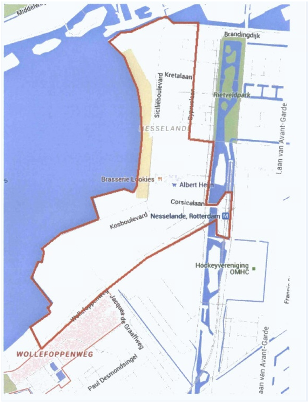 het gebied begrensd door de Siciliëboulevard, Brandingdijk, Korfoepad, Corsicalaan, Laan van Dada, metrostation Nesselande, Wollefoppenweg, Huysmanweg en Kosboulevard, de wegen, straten en plaatsen die de begrenzing aangeven daaronder begrepen.