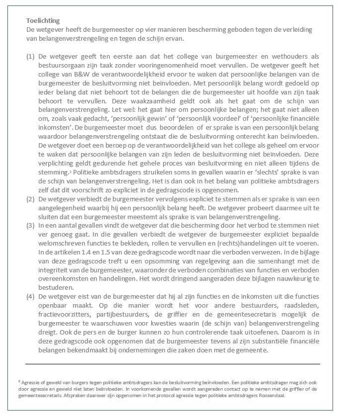 Voor elk van de drie bestuursorganen vraagt de wet een door de raad vast te stellen gedragscode. Voor Roosendaal zijn drie aparte codes opgesteld, die vanuit eenzelfde perspectief zijn geschreven. Daar waar ze identiek kunnen zijn, zijn ze identiek; waar ze moeten verschillen, gelet op de rol van elk bestuursorgaan en de onderliggende wettelijke regels, verschillen ze. De voorliggende gedragscode is bestemd voor de burgemeester.