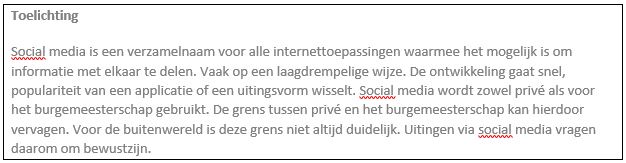 De burgemeester houdt zich ook op social media aan de in de gedragscode afgesproken regels. Hij is zich ervan bewust dat op social media allerlei grenzen, zoals tussen publiek en privé, vervagen en houdt rekening met de risico’s die het gebruik van social media meebrengt voor de uitoefening van zijn functie als burgemeester.