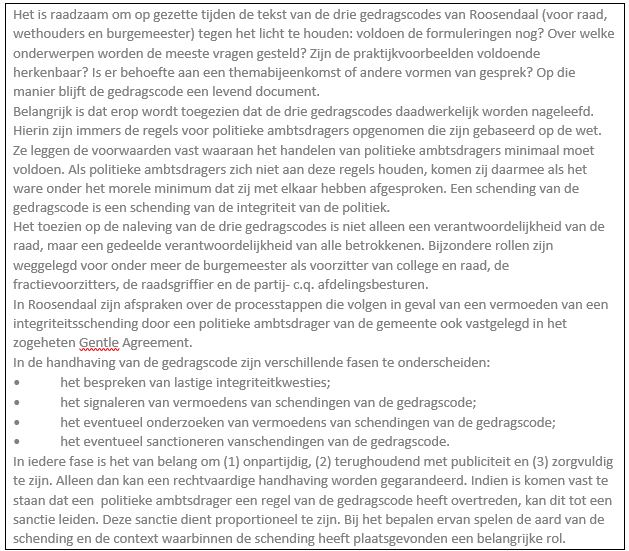 Afspraken over hoe te handelen in geval van een vermoeden van een schending van de regels uit deze gedragscode zijn separaat vastgelegd in het ‘Gentle agreement’ over de handhaving van de integriteit in de politiek’, zoals overeengekomen tussen de raadsleden van Roosendaal.