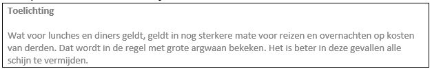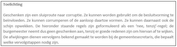 Let op: Het is van belang om te bekijken of het accepteren van giften in professionele zin daadwerkelijk noodzakelijk is en of er geen andere manieren zijn om dit doel te bereiken, zonder dat daarbij de schijn van corruptie wordt opgeroepen.
