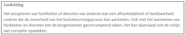 De burgemeester accepteert geen faciliteiten en diensten van anderen die hem uit hoofde van of vanwege zijn functie worden aangeboden, tenzij: