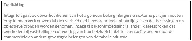 De burgemeester gaat terughoudend om met contacten met de tabaksindustrie. Contacten met de tabaksindustrie dienen te worden beperkt tot uitvoeringstechnische kwesties. Dit is van belang om te voorkomen dat contact met de tabaksindustrie kan leiden tot maatregelen die (in)direct kunnen aanzetten tot roken.