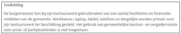 De burgemeester gebruikt faciliteiten of diensten van anderen die uit hoofde of vanwege de bestuursfunctie worden aangeboden, niet voor privédoeleinden.