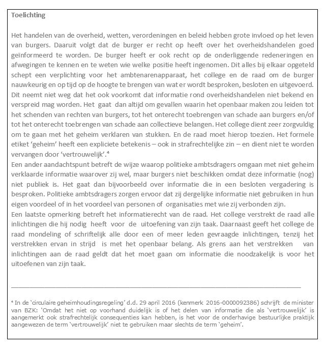 De raad ziet erop toe dat het college van burgemeester en wethouders de raad goed informeert. Het college en de burgemeester verstrekken alle inlichtingen die de raad voor de uitoefening van zijn taak nodig heeft, tenzij dit in strijd is met het openbaar belang. De raad, het college en de burgemeester kunnen geheimhouding opleggen overeenkomstig te wet.