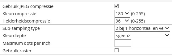 Als u kleurenscans in een ander formaat dan TIFF wilt opslaan in Decos, dient u JPEG-compressie in te stellen op de Decos server en op elke PC waarop Decos – work station actief is. Het is mogelijk instellingen per pc aan te passen aan een lokale scanner. Onderstaande opties zijn mogelijk: