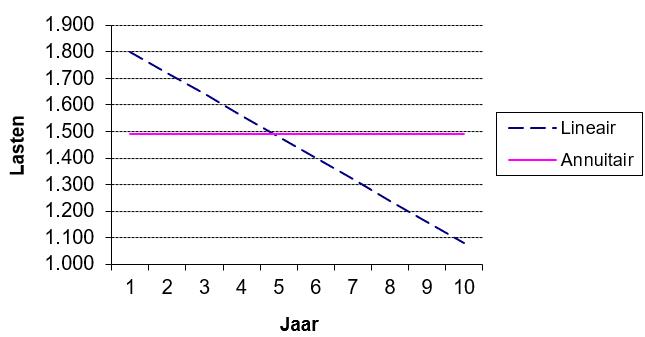 Ter illustratie van het verschil tussen beide methoden staat in onderstaande figuur het verloop van de jaarlijkse kapitaallasten over een periode van 10 jaar voor een investering van € 10.000 bij een rentepercentage van 8% met zowel lineaire als annuïtaire afschrijving.