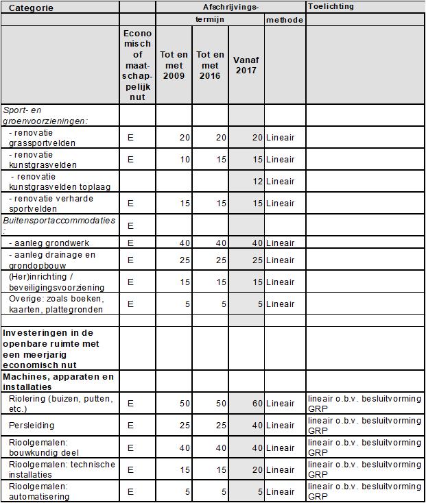 De in de afschrijvingstabel opgenomen termijnen/ afschrijvingsmethode gelden voor nieuwe investeringen vanaf 1 januari 2017. Voor de bestaande activa geldt de levensduur en wijze van afschrijven zoals bepaald in eerdere activanota’s.