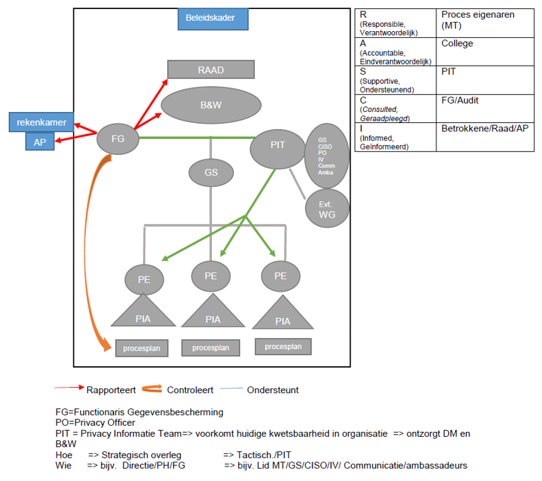 De wet wijst het college aan als de probleemeigenaar van privacy beleidsvoering (de ‘verwerkingsverantwoordelijke’), maar het college zal op zijn beurt de uitvoering aan anderen opdragen. Op alle niveaus dienen rollen en verantwoordelijkheden duidelijk te zijn, en zijn er afspraken nodig over het afleggen van interne verantwoording. Uiteindelijk is iedereen op zijn/haar eigen manier verantwoordelijk voor geslaagde privacy beleidsvoering. Het college blijft in alle gevallen eindverantwoordelijk.