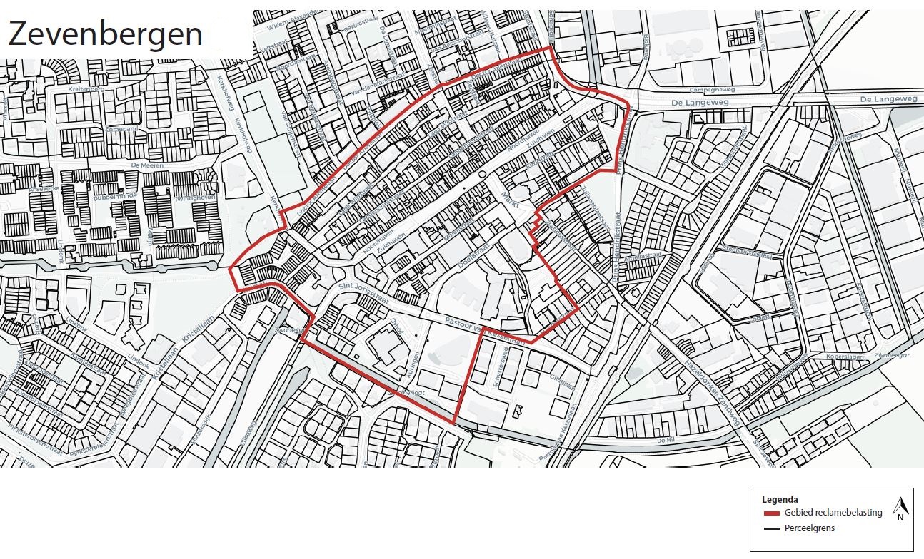 Onder de naam reclamebelasting Zevenbergen wordt, binnen het gebied zoals nader aangewezen op de bij deze verordening behorende kaart, een directe belasting geheven voor een openbare aankondiging die zichtbaar is vanaf de openbare weg.