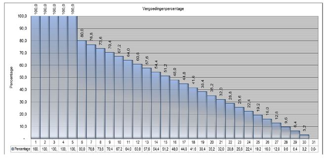 Voor transportleidingen geldt indien de vergunning gewijzigd of ingetrokken wordt in de periode gelegen tussen vijf tot en met dertig jaren, gerekend vanaf de datum van de inwerkingtreding van de betrokken vergunning/instemming, wordt de schadevergoeding vastgesteld als percentage van de berekende schade, dat lineair gerelateerd is aan tijdsduur tussen datum inwerkingtreding vergunning/instemming tot en met de datum van wijzing/intrekking van de vergunning/instemming, aflopend van 80% in jaar 6, naar 0 % in jaar 30. Dit geldt zowel voor leidingen die in een droge omgeving liggen als voor leidingen die in een natte omgeving (waterwegen of waterkerende dijken) liggen en voor langs liggende en kruisende leidingen.