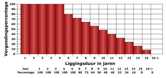 Voor distributieleidingen geldt indien de vergunning gewijzigd of ingetrokken wordt in de periode gelegen tussen vijf en vijftien jaren, gerekend vanaf de inwerkingtreding van de betrokken vergunning, wordt de schadevergoeding vastgesteld als percentage van de geleden schade, dat lineair gerelateerd is aan tijdsduur tussen datum inwerkingtreding vergunning/instemming tot en met de datum van wijzing/intrekking van de vergunning/instemming aflopend van 80% in jaar 6, naar 0 % in jaar 15. Dit geldt zowel voor leidingen die in een droge omgeving liggen als voor leidingen die in een natte omgeving (waterwegen of waterkerende dijken) liggen en voor langs liggende en kruisende leidingen.