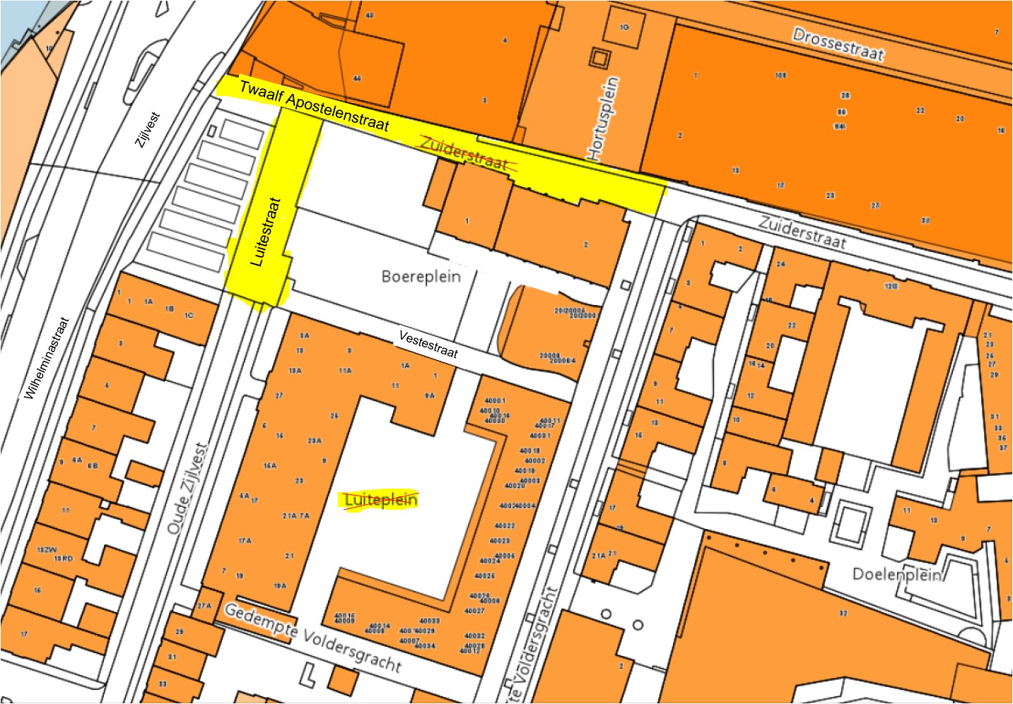 Het Luiteplein wordt opgeheven, dit blijkt geen openbaar gebied te zijn en er zijn geen adressen aanwezig en daarom gebruiken we nu de naam Luite als Luitestraat in het verlengde van de Oude Zijlvest tot aan de Twaalf Apostelenstraat waar we niet kunnen adresseren voor huisnummer 1.