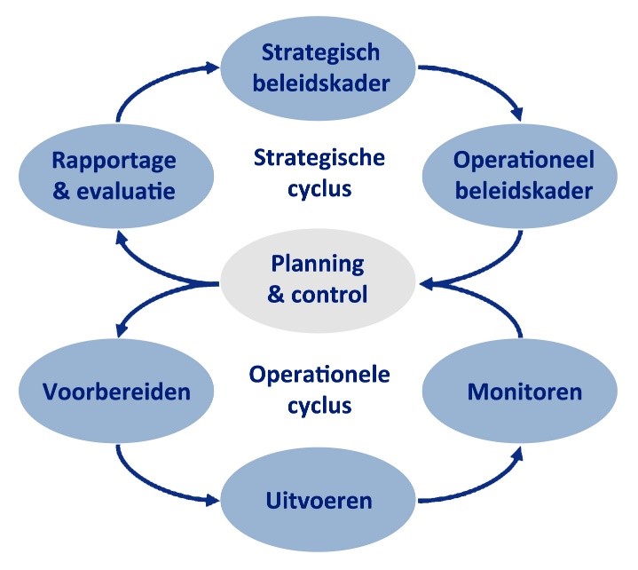 De verschillende stappen in de bovenste kring, de strategische cyclus, vormen samen het uitvoeringsbeleid. De onderste kring, de operationele cyclus, vormt het uitvoeringsprogramma. De gemeenschappelijke deler is ‘Planning & control’.