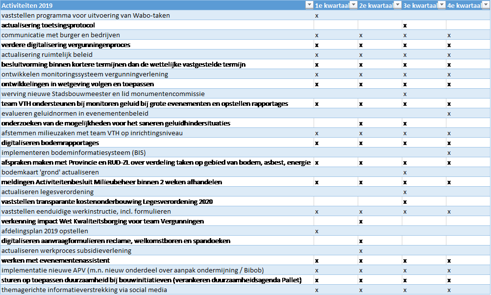 Hierna volgt het programma van activiteiten die team Vergunningen in 2019 uitvoert om aan de doelstellingen die in het uitvoeringsbeleid zijn opgenomen te voldoen.