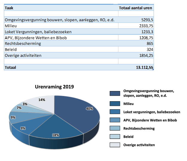 In het Afdelingsplan Publieksdiensten 2017 – 2018 is een zeer gedetailleerde urenraming opgenomen. De praktijk leert dat die mate van detaillering niet noodzakelijk en misschien zelfs niet efficiënt is. Er is daarom voor gekozen de raming met ingang van 2019 compacter te maken. De raming biedt een duidelijk overzicht van de taken die het team Vergunningen uitvoert, de uren die per taak (gemiddeld) worden besteed en het totaal aantal uren op jaarbasis voor de betreffende taak.
