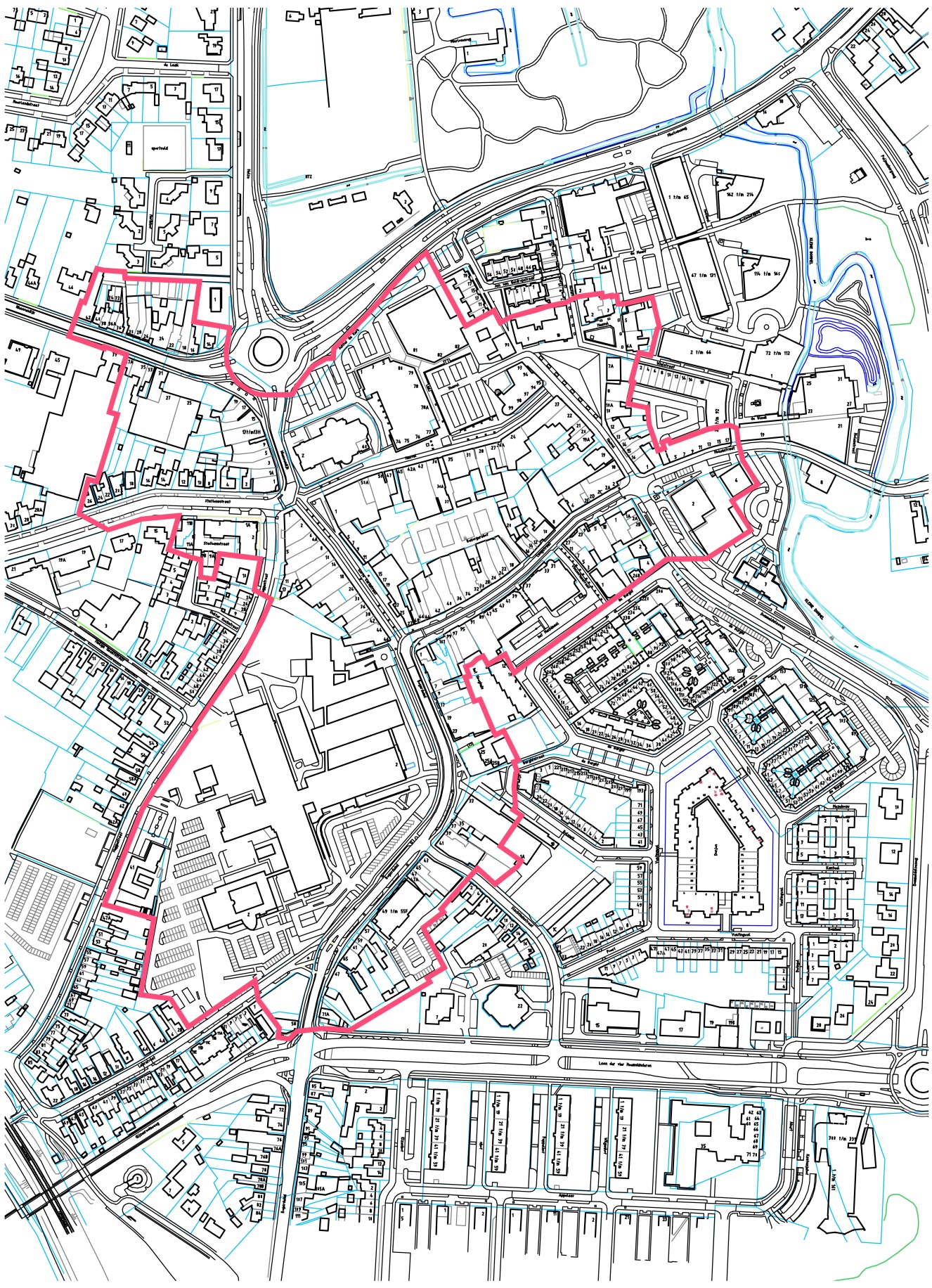 Het gebied waarop de verordening van toepassing is wordt begrensd door de straten als volgt aangeduid:
