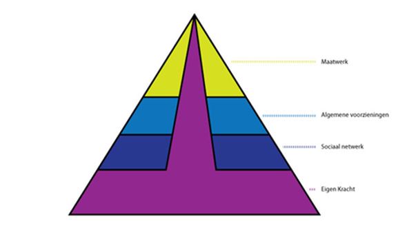 Dit betekent dat ingezet wordt op het vergroten van eigen kracht en inzet van het sociaal netwerk (lager in de piramide) als dat kan, maar zorgen dat voorzieningen als ‘vangnet’ beschikbaar zijn op momenten waarop het moet. Bij voorkeur wordt preventief gewerkt; dat wil zeggen zo vroeg mogelijk op zoek gaan naar oplossingen. Echter, wanneer er sprake is van een situatie waarin langdurig professionele ondersteuning nodig is, wordt dit ook gefaciliteerd.