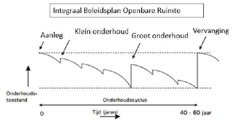 Na nieuwe aanleg is in eerste instantie dagelijks onderhoud voldoende om (een onderdeel van) de openbare ruimte schoon, heel en veilig te houden voor normaal gebruik. Na een bepaalde periode, die afhankelijk is van de functie en gebruiksdruk van een gebied, moet er groot onderhoud worden uitgevoerd, als dagelijks onderhoud niet meer afdoende is. Daarna is het gebruiksniveau weer op voldoende niveau. Wanneer ook met groot onderhoud het niveau niet meer op voldoende niveau gerealiseerd kan worden zal overgegaan worden tot vervanging, reconstructie of herinrichting. Al deze beheermaatregelen samen noemen we de cyclus van beheer (zie ook figuur 2 en bijlage 1 voor een verdere uitwerking) en worden uitgevoerd binnen de methodiek van assetmanagement (zie paragraaf 1.4). De cyclus van beheer heeft een lange doorlooptijd. De openbare ruimte wordt aangelegd voor een periode van minimaal 40 jaar of zelfs langer. Vanwege deze lange gebruiksperiode is het extra van belang goed na te denken over de gewenste maatschappelijke bijdragen van de openbare ruimte.