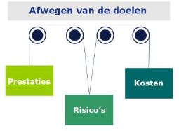Het beheer van die middelen is van groot belang: pas als het beheer goed wordt vormgegeven kan optimaal aan de organisatiedoelen worden bijgedragen. Bij het bepalen van het juiste beheer gaat assetmanagement uit van een integrale afweging van prestaties, risico’s en kosten, zoals in figuur 3.
