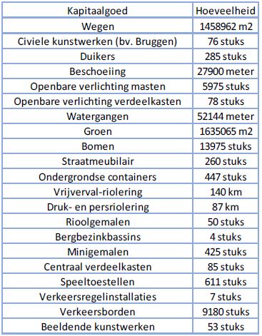 De gemeente voert beheer uit aan alle objecten (kapitaalgoederen) in de openbare ruimte. Dit beheer stelt eeuwigdurende instandhouding centraal en draagt samen met inrichting en gebruik bij aan de waarde van de openbare ruimte. Beheer betekent aanleg, dagelijks onderhoud en planmatig onderhoud. In onderstaande tabel zijn deze termen verder beschreven. Deze definities worden gebruikt zoals in de Besluit Begroting en Verantwoording provincies en gemeenten (BBV).
