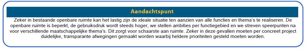 De afwegingen die in de openbare ruimte worden gemaakt moeten transparant zijn met een duidelijke argumentatie. Bewoners kunnen bij deze afwegingen betrokken worden. Hierbij is leidend dat participatie het algemeen belang van de openbare ruimte dient.