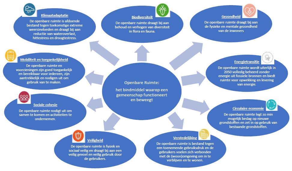 De openbare ruimte ligt er niet zomaar. Alle onderdelen van de openbare ruimte zijn aangelegd met een bepaald doel: een weg ligt er om verplaatsing door gebruikers mogelijk te maken, een trapveld ligt er om mensen te laten bewegen, verlichting om een veilig verblijf mogelijk te maken enzovoort. De openbare ruimte is aangelegd voor langdurig maatschappelijk nut voor een grote diversiteit aan gebruikers. De openbare ruimte moet bijdragen aan het behalen van de doelstelling van de gemeente: