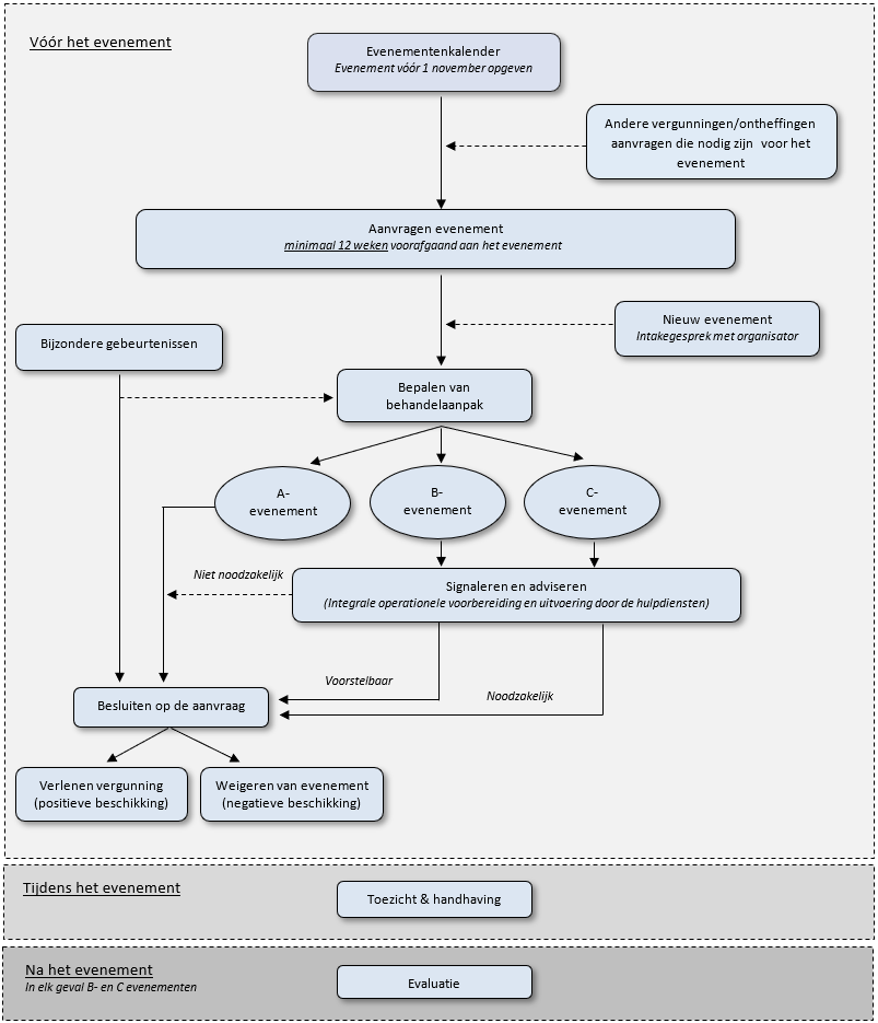 Voordat een evenement plaats kan vinden, is er veel wat een organisator moet regelen. Een belangrijk onderdeel van deze voorbereiding wordt gevormd door het vergunningverleningsproces. Dit proces begint al in het jaar voorafgaand aan het evenement en loopt door tot aan het einde van het evenement. In sommige gevallen vindt er ook een evaluatie achteraf plaats. Het vergunningverleningsproces zal in dit hoofdstuk stapsgewijs worden toegelicht. Aan het eind van dit hoofdstuk staan deze stappen ook nog schematisch weergegeven.