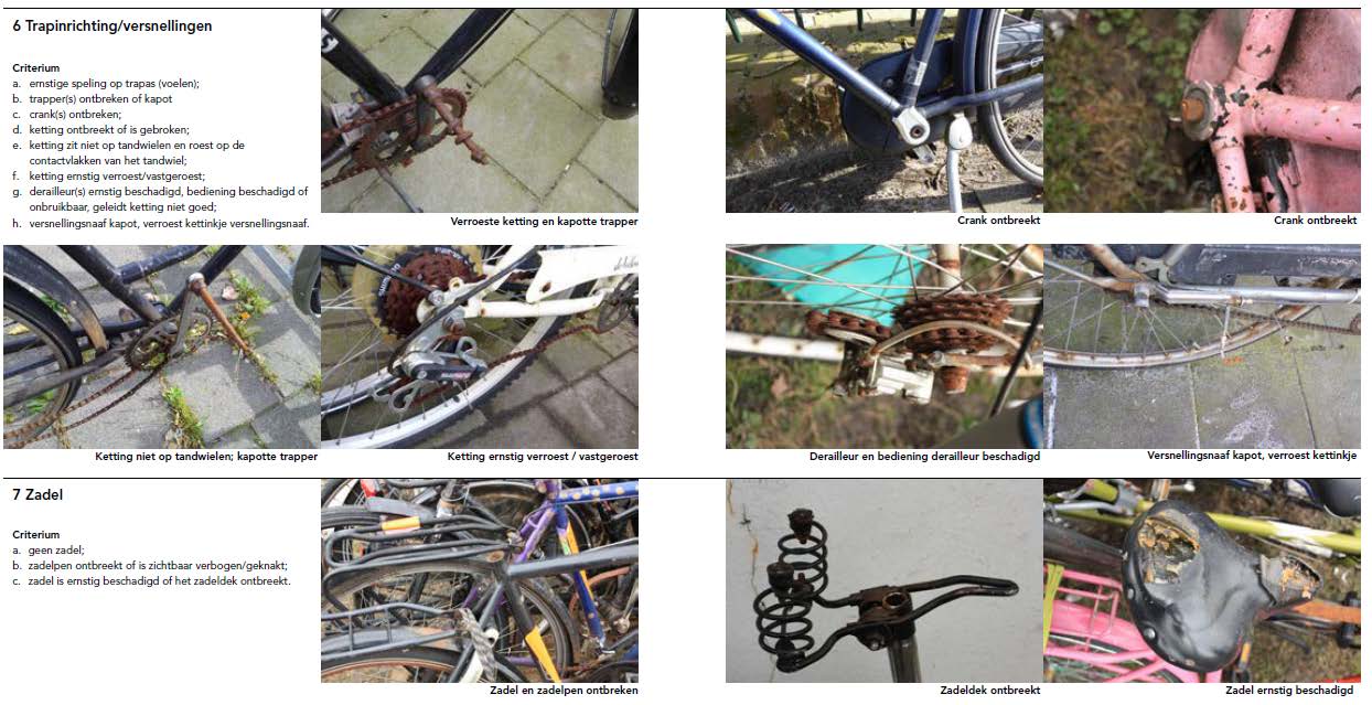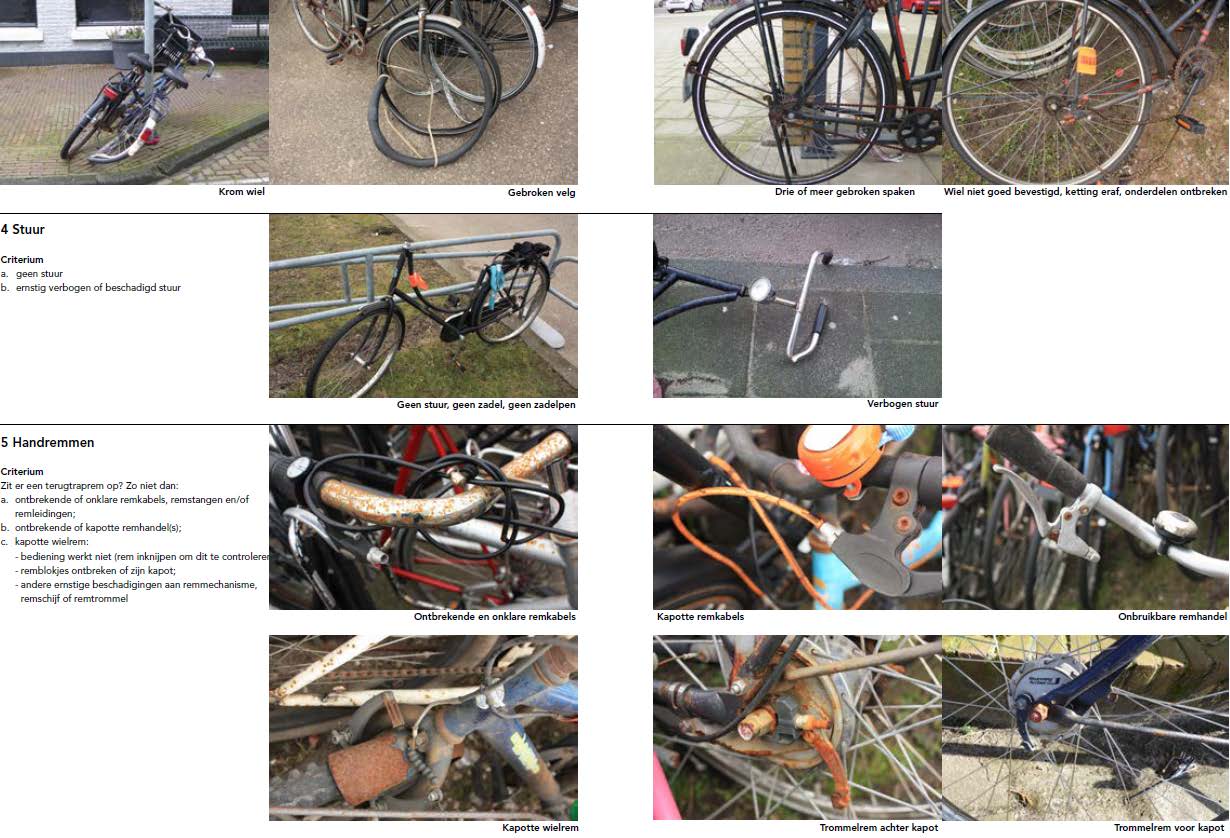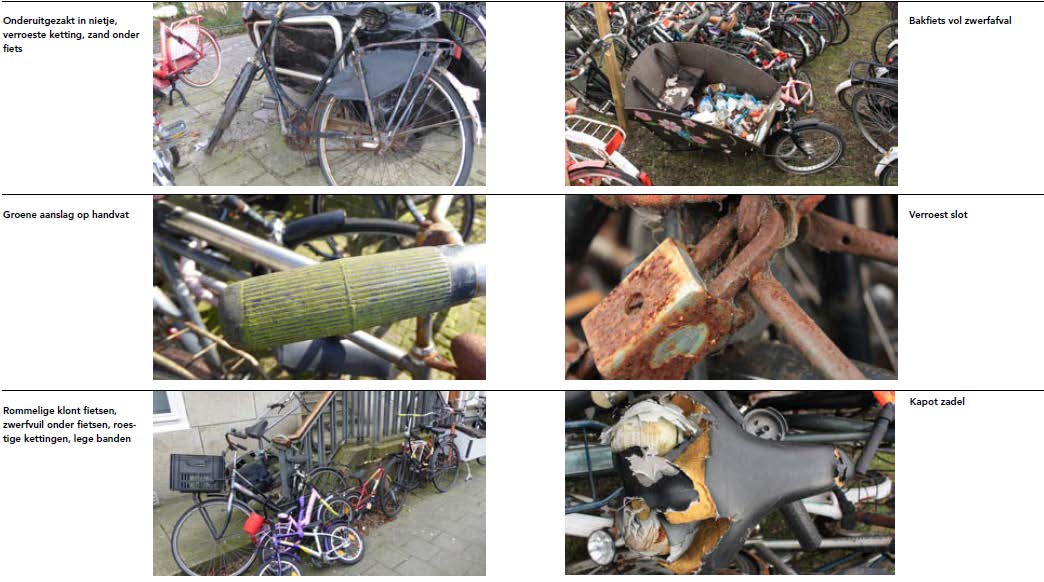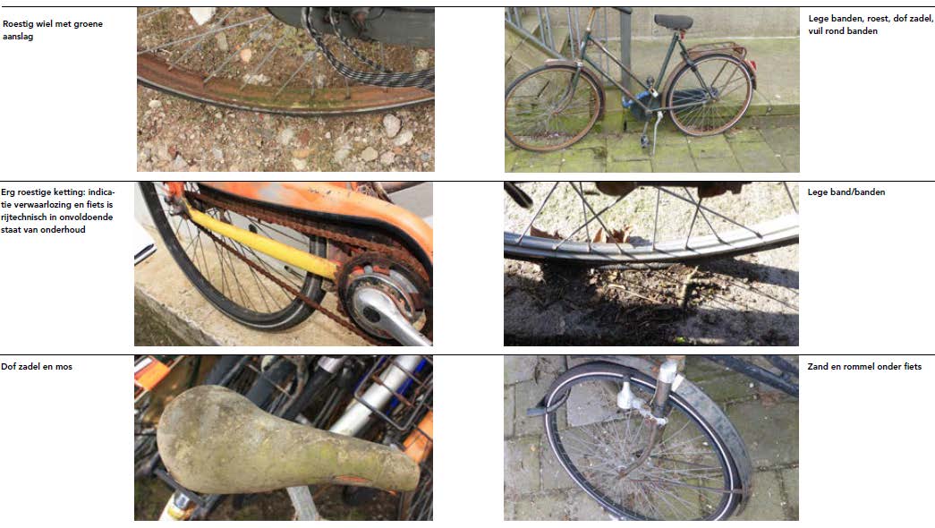Wanneer is een fiets verwaarloosd en wanneer is het een wrak? Met de hier beschreven werkinstructies en beoordelingscriteria geven we handvatten om deze overweging beredeneerd te maken. Willen we een verwaarloosde fietsen typeren, dan moet duidelijk zijn, dat met het beeld van de fiets het uiterlijk aanzien van de gemeente wordt geschaad. We kunnen dat vaststellen doordat de fiets naar uiterlijk aanzien in een zodanige staat is dat er is lang niet op gereden is en de eigenaar er kennelijk afstand van heeft gedaan. Bijvoorbeeld omdat de banden leeg zijn, de ketting eraf ligt, het stuur of zadel voor direct gebruik onbruikbaar zijn, enzovoort. Ook het algehele omgevingsbeeld kan bijdragen aan deze beoordeling, wanneer de fiets er kennelijk al zo lang ongebruikt staat dat zwerfafval en onkruid vrij spel hebben. In kennelijk verwaarloosde toestand betekent dat duidelijk is dat de fiets niet gebruikt of onderhouden wordt. De eigenaar zou de fiets nog wel kunnen laten repareren, maar neemt daar kennelijk niet de moeite voor.