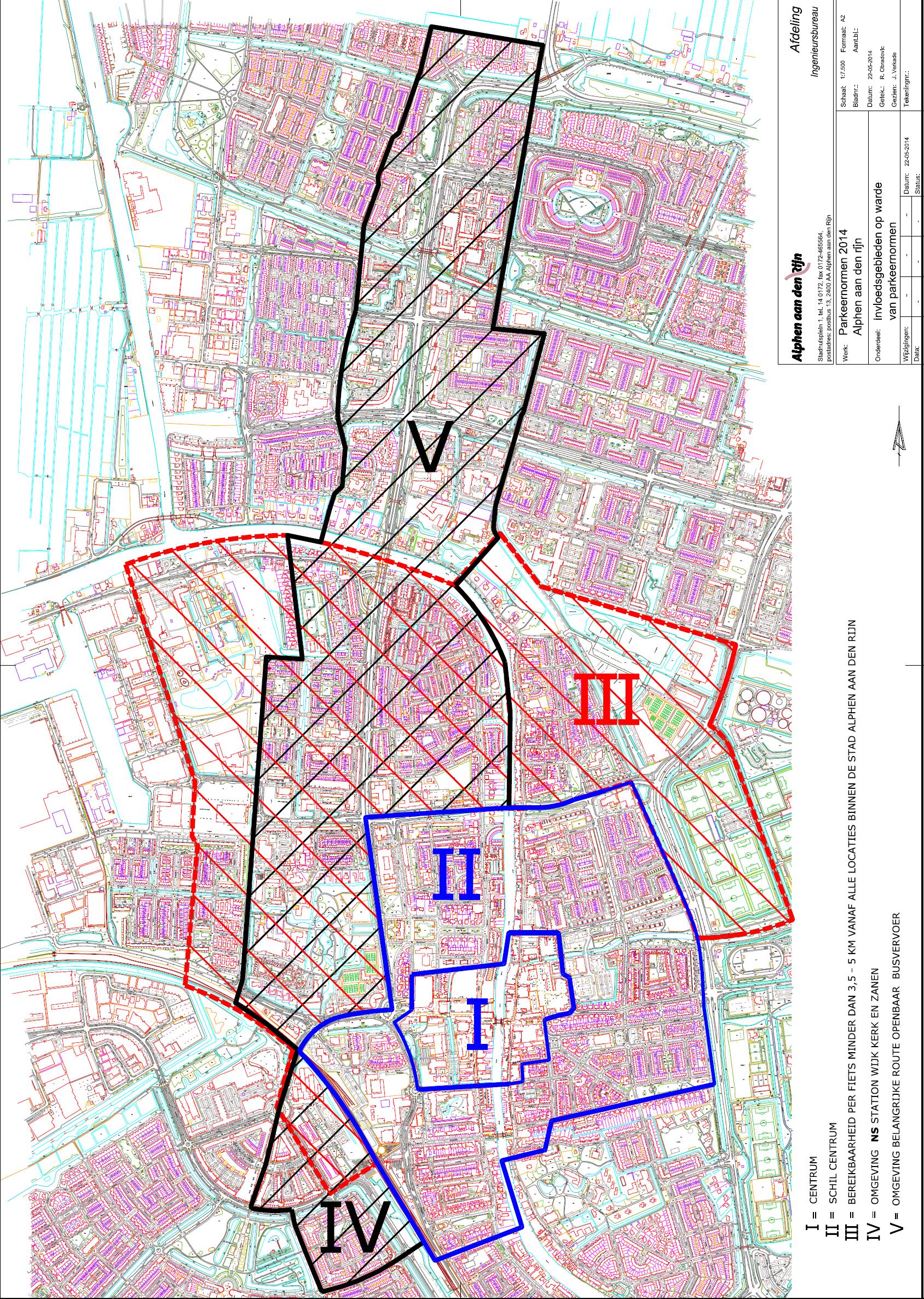 Fig. 1a. stad Alphen aan de Rijn: centrum (I), schil centrum (II), invloedsgebieden fiets (III), NS station (IV) en openbaar vervoer (V): zie externe Bijlage