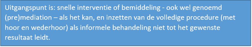 Uitgangspunt dient te zijn: snelle interventie of bemiddeling als het kan en het inzetten van volledige procedure de (met hoor en wederhoor) als informele behandeling niet tot gewenst resultaat leidt.