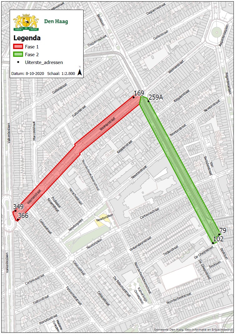 Deel Weimarstraat: oneven kant huisnummer 169 t/m 349 | even kant 180 t/m 366 (inclusief alle hoekpanden op de Weimarstraat van de aangrenzende straten Fahrenheitstraat, Celciusstraat, Professor Kaiserstraat, Marconistraat, Herschelstraat, Noorderbeekdwarsstraat).