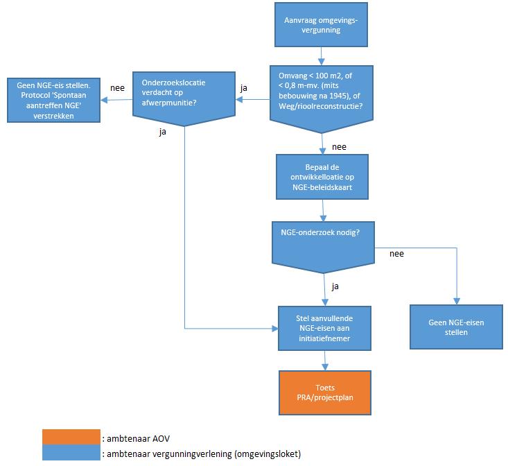 Iedere persoon of organisatie die van plan is om grondverzet te plegen, bouwprojecten of infrastructurele plannen te ontwikkelen, te baggeren, et cetera, is verplicht om zich te informeren over de mogelijke aanwezigheid van NGE op het betreffende perceel. Dit geldt zowel voor gemeentelijke als voor niet-gemeentelijke projecten. Een initiatiefnemer is verantwoordelijk voor de veiligheid van zijn eigen medewerkers en personen die in zijn opdracht werkzaamheden uitvoeren.