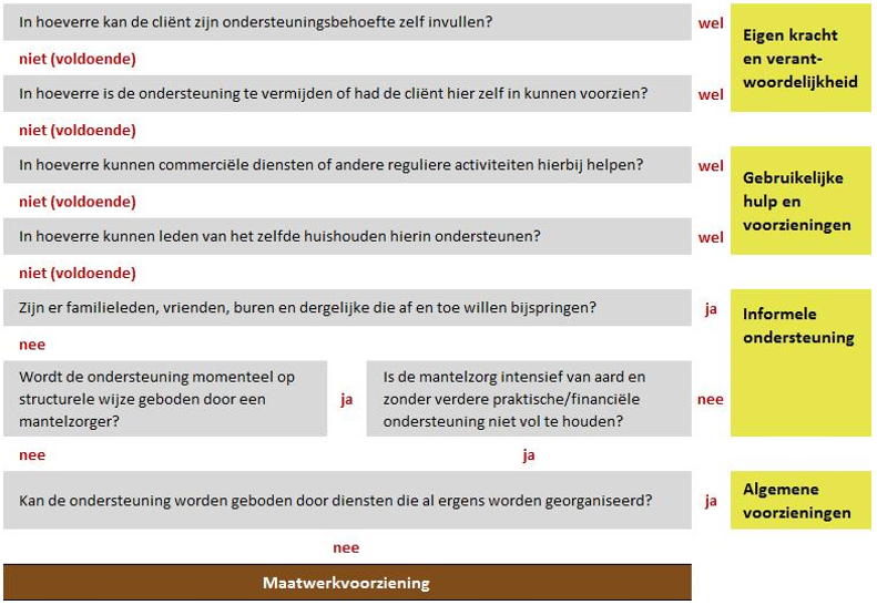 Deze afwegingskader komt aan de orde nadat de ondersteuningsbehoefte is vastgesteld. Met behulp van de beslisboom kan de afweging wel of geen maatwerkvoorziening zorgvuldig worden gemaakt.