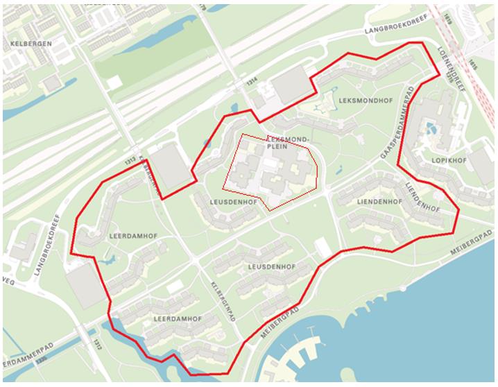 Hieronder een visuele weergave van het gebied waar de RVV ontheffing voor bewoners van autovrij gebieden geldig is. De ontheffing geeft het recht om vanaf de entree tot het gebied ter plaatse van de parkeergarage Leerdamhof via de kortst mogelijke route via fietspaden of trottoir bij de woning te komen en daar te laden of te lossen. Dit laden en lossen dient onmiddellijk te gebeuren. Daarna moet het gebied via de kortst mogelijke route naar de uitgang bij parkeergarage Leerdamhof worden verlaten. Op het maaiveld van het Lexmondplein is de ontheffing niet te gebruiken omdat dit buiten de directe route naar de woningen ligt.