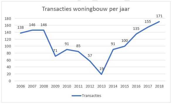 Onderstaande grafiek laat zien hoe het aantal woningbouwtransacties per jaar zich heeft ontwikkeld. Sinds 2017 ligt het aantal transacties op een hoger niveau dan de jaren voor de crisis. Ten opzichte van 2014 is de woningmarkt in Noord-Beveland dus aanzienlijk veranderd, de vraag heeft zich hersteld. Dit blijkt mede uit het feit dat er ook weer projectmatige nieuwbouwproject plaatsvindt maar ook het aantal transacties in de bestaande voorraad is weer op niveau. Op basis van deze recente markttransacties kan eenvoudig en goed de opbrengstwaarde van woningen t.b.v. de grondprijsbepaling worden herleid. De methodiek is in 2019 herijkt en is hetzelfde gebleven. In 2019 zijn de grondprijzen opnieuw bepaald voor 2020. Er is momenteel geen aanleiding om de grondprijzen aan te passen met het oog op de coronacrisis.