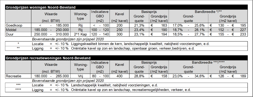 De basisprijs van de woningen is gebaseerd op een gemiddelde kwaliteit. De grondprijzen worden zowel uitgedrukt in grondquote (percentage van de VON-prijs) als in kavelprijzen per m².